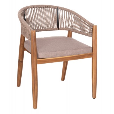 Η πολυθρόνα τραπεζαρίας εξωτερικού χώρου NAVAN συνδυάζει αρμονικά διαφορετικά υλικά κατασκευής. Τα πόδια είναι από ξύλο ακακίας στο ΦΥΣΙΚΟ του χρώμα, ενώ ο σκελετός της πλάτης είναι μεταλλικός με πλέξη από nylon σχοινί σε ΜΠΕΖ χρώμα. Το κάθισμα διαθέτει μαξιλάρι με πολυεστερικό ύφασμα επίσης σε ΜΠΕΖ χρώμα. Οι σχεδιαστικές γραμμές είναι κομψές και με γνώμονα την άνεση του χρήστη και θα αποτελέσει το κέντρο ενδιαφέροντος οπουδήποτε και αν τοποθετηθεί, ιδιαίτερα όμως αν συνδυαστεί με το ανάλογο τραπέζι.