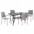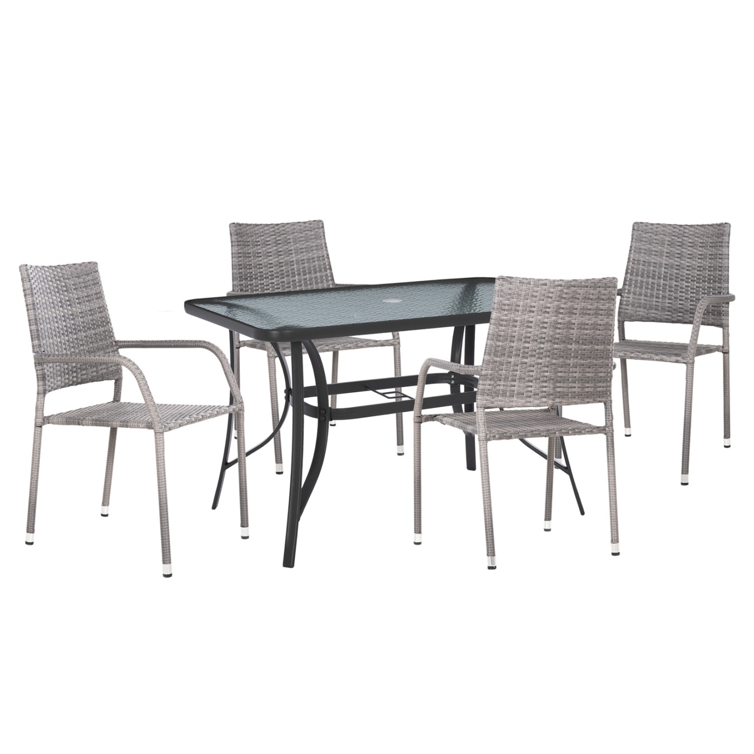 Αυτό το Σετ τραπεζαρίας εξωτερικού χώρου διαθέτει τραπέζι με ΓΚΡΙ μεταλλικό σκελετό και γυάλινη θολή ΕΝΙΣΧΥΜΕΝΗ επιφάνεια με τρύπα για ομπρέλα και 4 πολυθρόνες μεταλλικές επενδυμένες με πλέξη wicker rattan σε ΓΚΡΙ χρώμα.