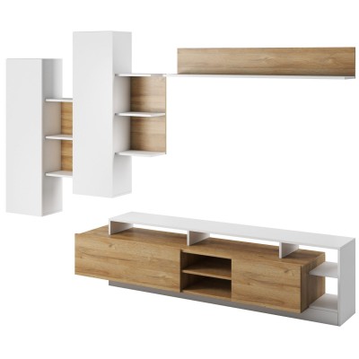 Το σύνθετο σαλονιού της σειράς Oak, χάρη στον μοντέρνο minimal σχεδιασμό του, θα τραβήξει τα βλέμματα και θα γίνει το κέντρο του σαλονιού σας. Αποτελείται από δύο κρεμαστά ντουλάπια, ένα ράφι και μια κομψή βάση τηλεόρασης με ιδιαίτερο design. Τα ντουλάπια έχουν δύο ράφια στο εσωτερικό τους και διαθέτουν μηχανισμό ανοίγματος χωρίς χερούλια. Η βάση τηλεόρασης έχει πολλά ράφια σε διαφορετικά σχήματα, καθώς και δύο ευρύχωρα ντουλάπια.
