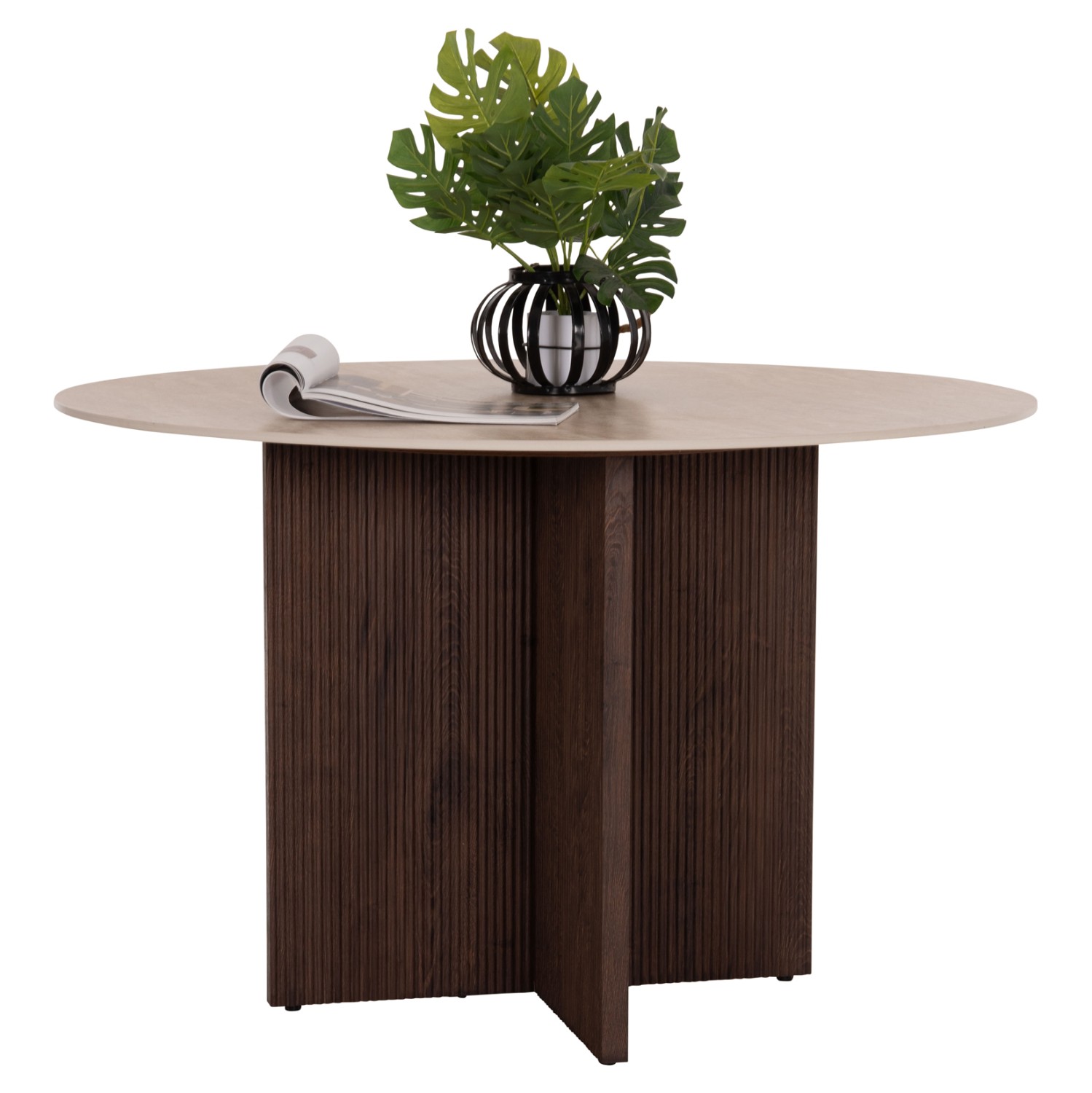 Το τραπέζι τραπεζαρίας SKY είναι στρογγυλό και αποτελεί νέα προσθήκη στην γκάμα μας. Η επίπεδη επιφάνειά του είναι κεραμική σε χρωματισμό TRAVERTINE STONE, ενώ η βάση του είναι σταυρωτή κατασκευασμένη εξολοκλήρου από MDF σε καφέ χρώμα, με όμορφες πτυχώσεις.