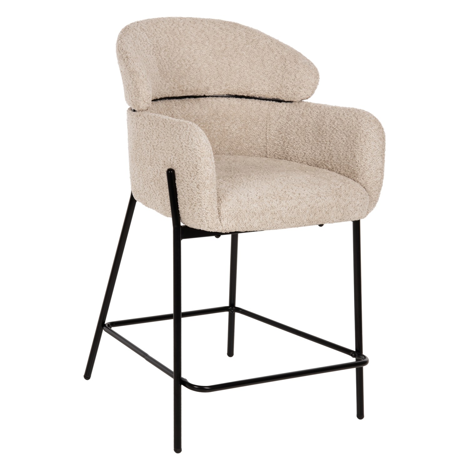 Επαγγελματικό σκαμπό bar WOLF σε ΕΚΡΟΥ χρώμα με ΜΑΥΡΑ μεταλλικά πόδια. Τα πόδια ενώνονται μεταξύ τους περίπου στη μέση τους με μια μεταλλική ράγα. Το σκαμπό είναι λιτό, ποιοτικό και κομψό στην όψη, και σίγουρα τραβάει τα βλέμματα με το ύφασμα μπουκλέ που είναι επενδυμένο. Είναι μεσαίου ύψους με πλάτη η οποία αγκαλιάζει το σώμα ενώ διαθέτει σχετικά ψηλά μπράτσα, πράγμα που επιτείνει τον αναπαυτικό χαρακτήρα αυτού του σκαμπό.